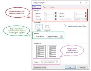 Se você for imprimir seu trabalho utilizando frente e verso, você deve selecionar a configuração de “Margens Espelho”, com as seguintes dimensões: