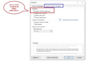 Dica Trabalho em ABNT: configure também as quebras de linha para a opção “Controle de linhas órfãs/viúvas”. Dessa forma, nunca haverá uma linha sozinha no início ou final da página.
