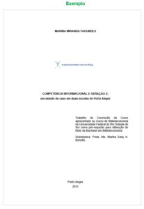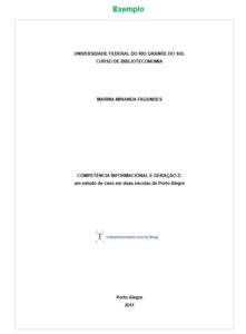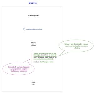 Observação: a ABNT NBR 14724/2011 não define a tipografia exata para folha de rosto, portanto, recursos como tamanho da fonte e destaques poderão variar conforme solicitação das instituições de ensino.