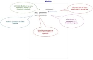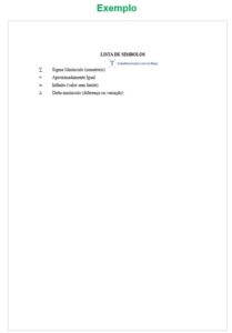A lista de símbolos também é um elemento opcional e deve ser elaborada de acordo com a ordem em que os elementos aparecem no texto, seguidos de seu devido significado.