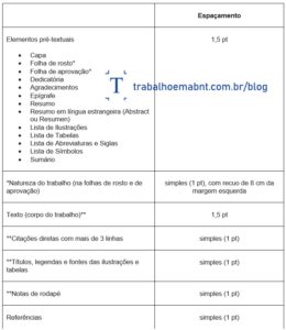 As normas da ABNT indicam o uso de espaçamento entre linhas de 1,5 para todo o trabalho, com algumas exceções: