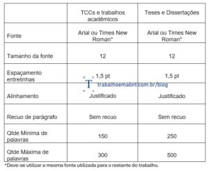 O resumo deve ser escrito em parágrafo único, sem recuo, e convém usar o verbo na terceira pessoa. A fonte deve ter tamanho 12 com alinhamento justificado, e o espaçamento entrelinhas deve ser de 1,5 para trabalhos acadêmicos em geral (TCCs, Teses e Dissertações).